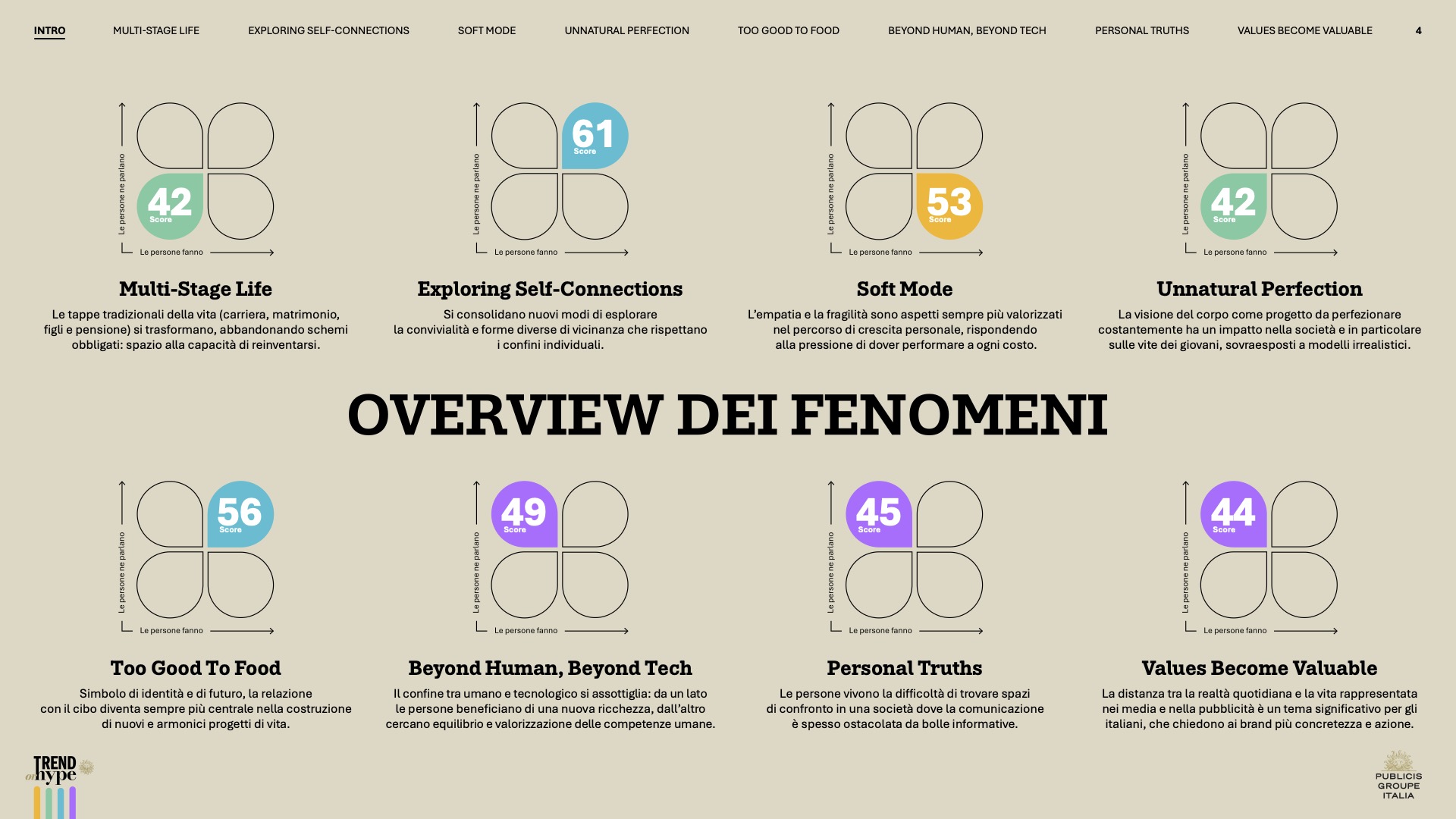 Attraverso un approccio che combina dati quantitativi e insight qualitativi, focus group, social listening e analisi dei comportamenti di navigazione e acquisto, con interviste ai C-level delle aziende italiane, la ricerca setaccia 8 fenomeni chiave e li colloca in una matrice a 4 quadranti (Trend, Hype, Emerging, Mainstream) per valutarne il grado di maturità. Nella matrice, l’esplorazione della connessione con sé stessi e il ruolo del cibo come linguaggio identitario si consolidano come trend, mentre gli hype intercettano le tensioni più pressanti del contemporaneo, dal confine sempre più sfumato tra umanità e tecnologia alla frammentazione della verità in una molteplicità di narrazioni soggettive.