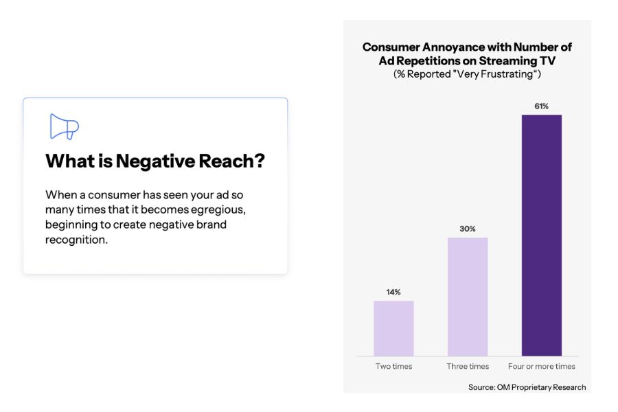 La frequenza è la più incompresa e mal gestita tra le metriche della pubblicità, spiega Omnicom Media, aggiungendo che la tolleranza del pubblico dipende dagli obiettivi della campagna, dall'audience e dal contesto. Quindi il minimo potrebbe già essere troppo