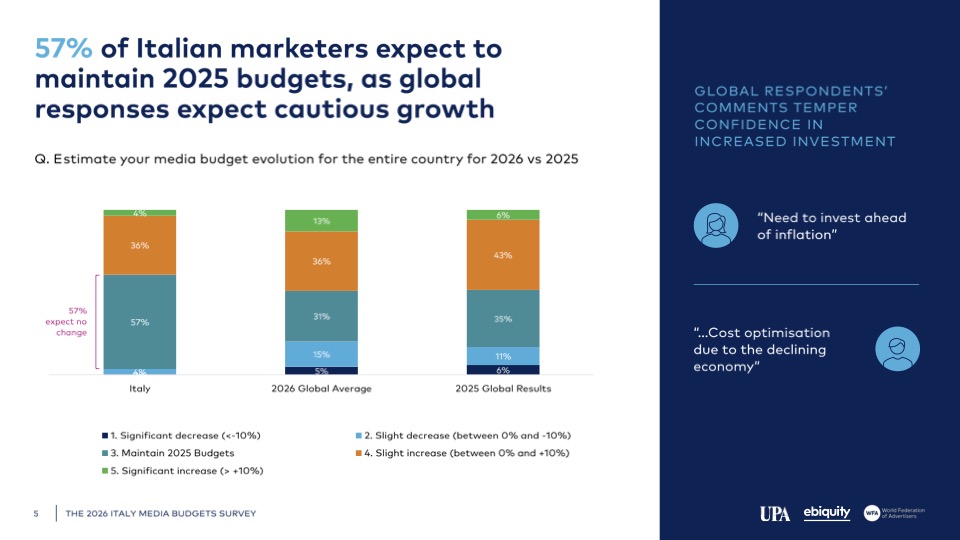 Lavorando in collaborazione con Wfa e le associazioni di 16 Paesi tra i quali Upa, Ebiquity ha indagato le intenzioni dei marketer riguardo gli investimenti pubblicitari per il 2026.