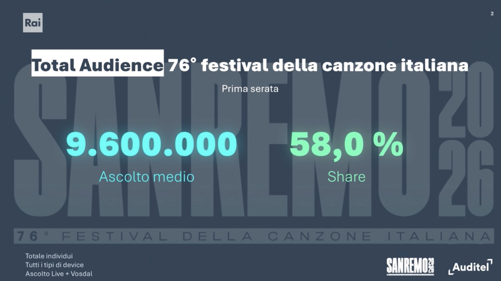 Il Festival di Sanremo si è confermato l’evento più visto in Italia, quarto miglior risultato di share dal 1997 ad oggi. La prima serata ha registrato un ascolto medio total audience (tv, smart tv e small screen) pari a 9,6 milioni individui, con una share del 58% sui 16,1 milioni di individui che ieri sera hanno guardato la tv. Un po’ meno dello scorso anno, quando avevano toccato quota 18,7 milioni, ha detto il direttore generale di Auditel Paolo Lugiato, durante la conferenza stampa relativa alla prima serata del festival.
