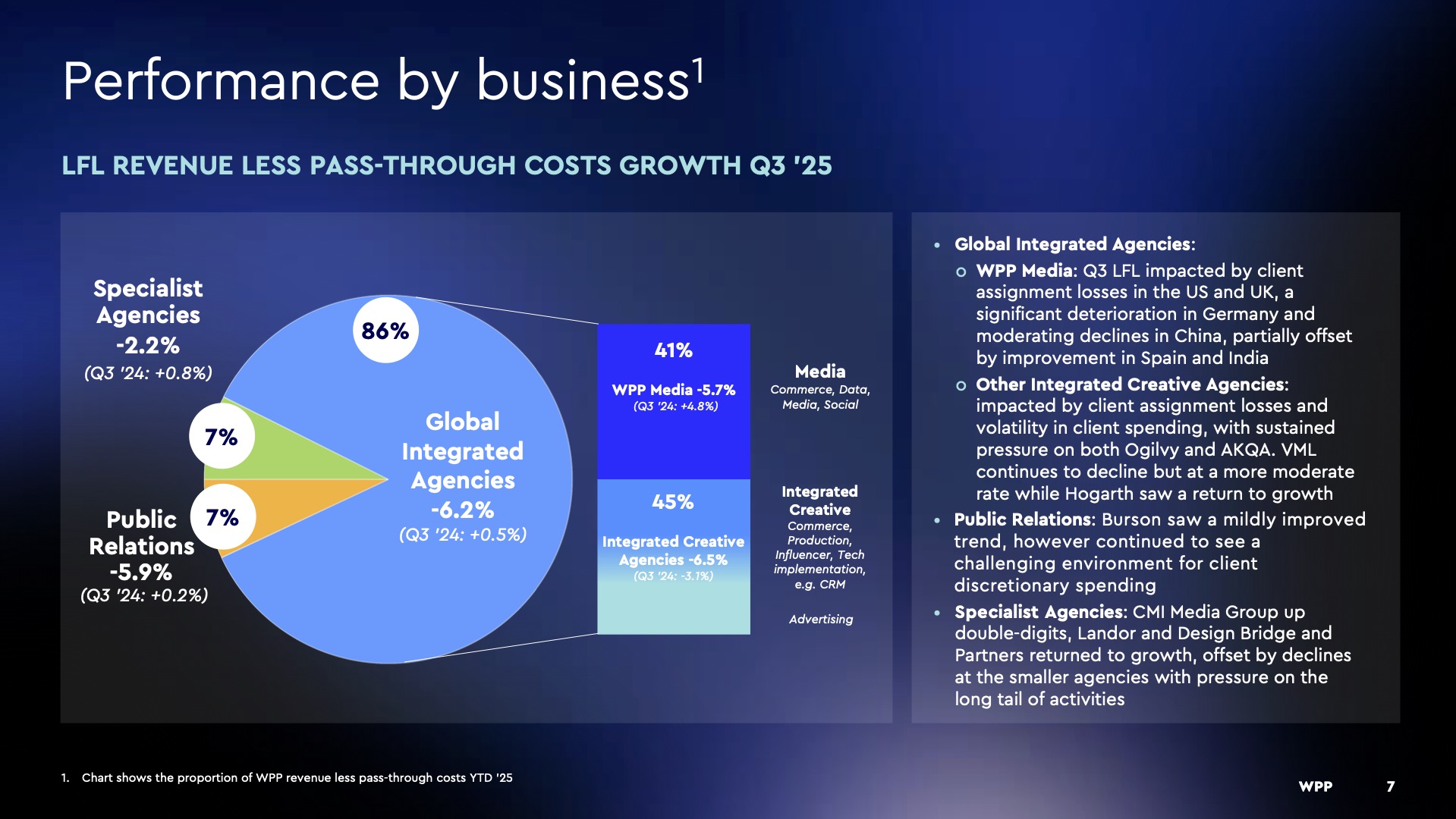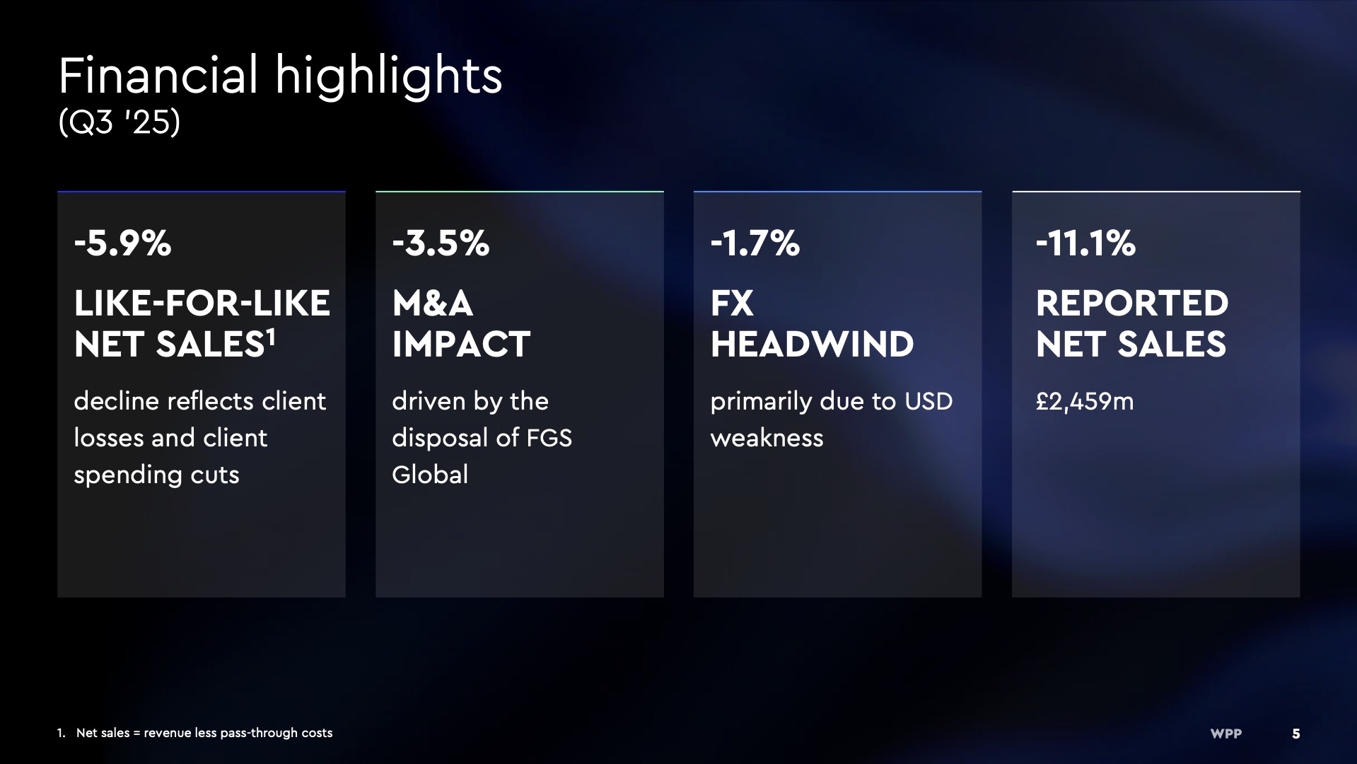 Nel terzo trimestre 2025, Wpp ha registrato ricavi netti per 2,45 miliardi di £, che hanno comportato un calo organico del 5,9%. Su base rendicontata (3,25 miliardi £), sono calati del 8,4% e del 3,5% a parità di perimetro. Nei nove mesi, il calo organico è invece del 4,8%.