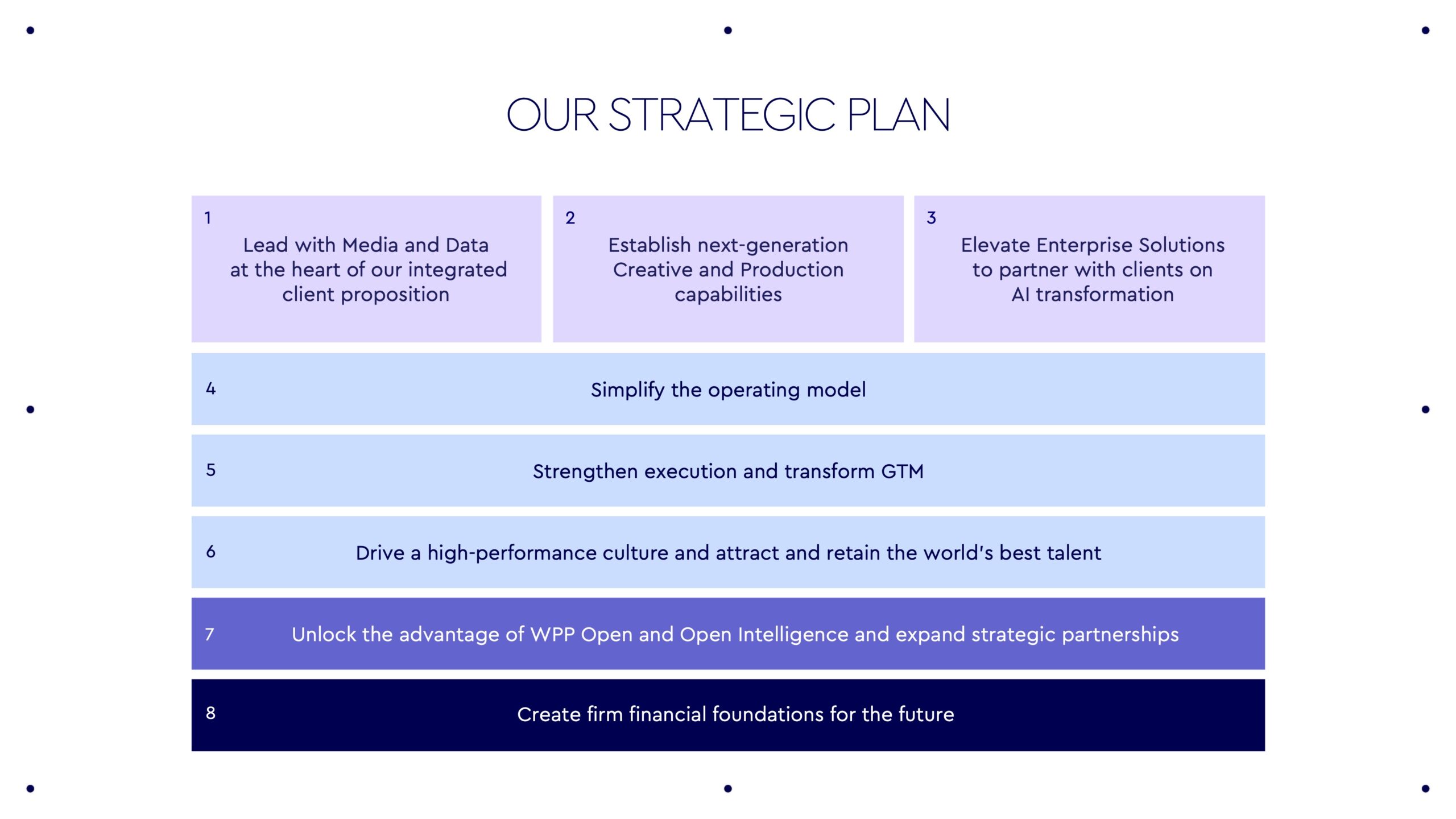 “I miei primi sei mesi da CEO non hanno fatto altro che rafforzare la mia convinzione che WPP sia un’azienda straordinaria”, ha dichiarato Rose che con il nuovo piano intende “stabilizzare il business, tornare alla crescita organica, creare capacità di investire nel futuro e offrire rendimenti interessanti ai nostri azionisti”. Nel corso della earning call, Rose ha detto che WPP non sarà più una holdco, ma una singola compagnia operativa e la nostra missione sta cambiando: vogliamo essere un partner di fiducia per i nostri clienti nell’era dell’IA”.