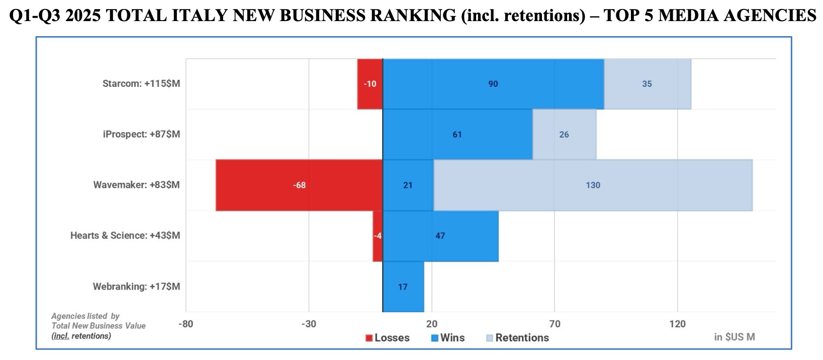 Grazie alla vittoria della gara media Enel dal valore di ben 96 milioni di dollari, più quella di Aldi da 18 milioni e la conferma da parte di altri clienti, Starcom si piazza in testa alla classifica del New Business barometer di COMvergence relativo ai primi nove mesi del 2025.