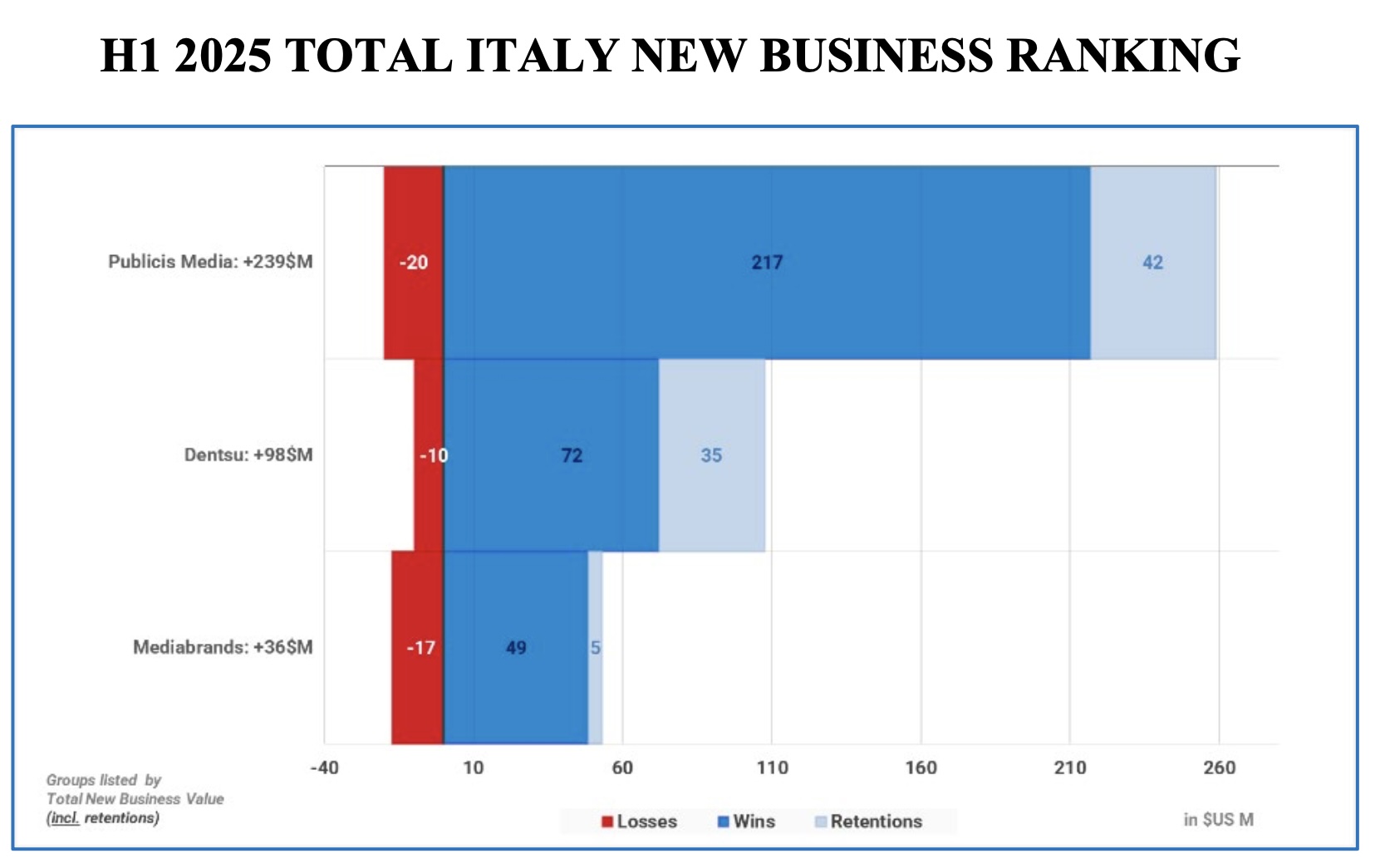 A livello di gruppo, Publicis Media guida la classifica con new business dal valore totale di 217 milioni di dollari, grazie all’acquisizione di 11 nuovi clienti e la riconferma di altre aziende 42 milioni, per un totale di 239 milioni.