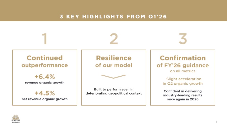 Dopo un 2025 chiuso con una crescita organica del 5,6% e ricavi netti per 14,5 miliardi di euro, Publicis Groupe ha archiviato un primo trimestre con una crescita organica del 6,4% e ricavi per 4,1 miliardi di euro. I ricavi netti nel Q1 2026 si sono attestati a 3,4 miliardi di euro, rispetto ai 3,5 miliardi dell’anno precedente, in crescita del 4,5%. Su questi hanno pesato i tassi di cambio con un impatto negativo di 268 milioni di euro, mentre le acquisizioni (al netto delle dismissioni) hanno contribuito positivamente per 46 milioni.