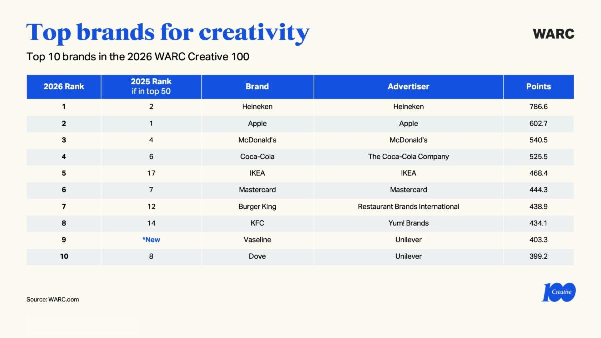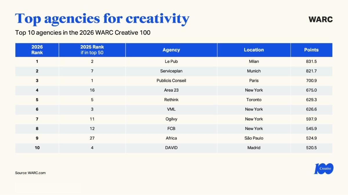 È uscita la classifica Warc Creative 100, stilata sulla base dei premi vinti nelle principali competizioni pubblicitarie dell’anno 2025 e accompagnata da una survey globale.
