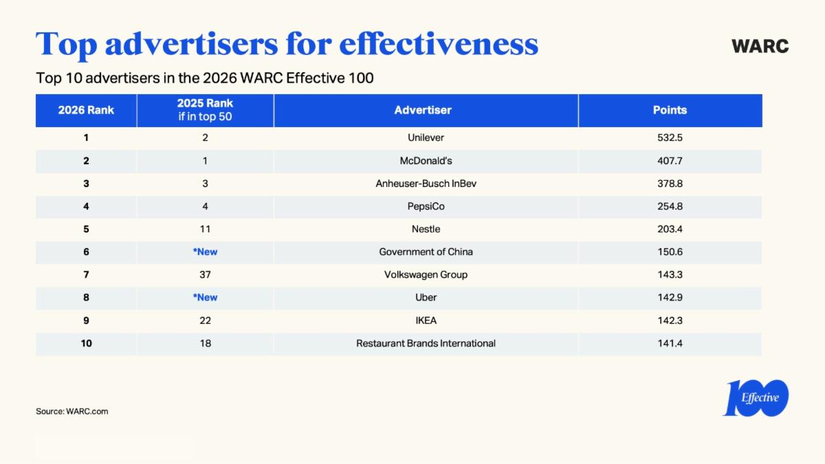 Unilever ritorna in prima posizione nella classifica degli advertiser, con 5 campagne nella top 100 e 29 marchi presenti nel database Effective 100.