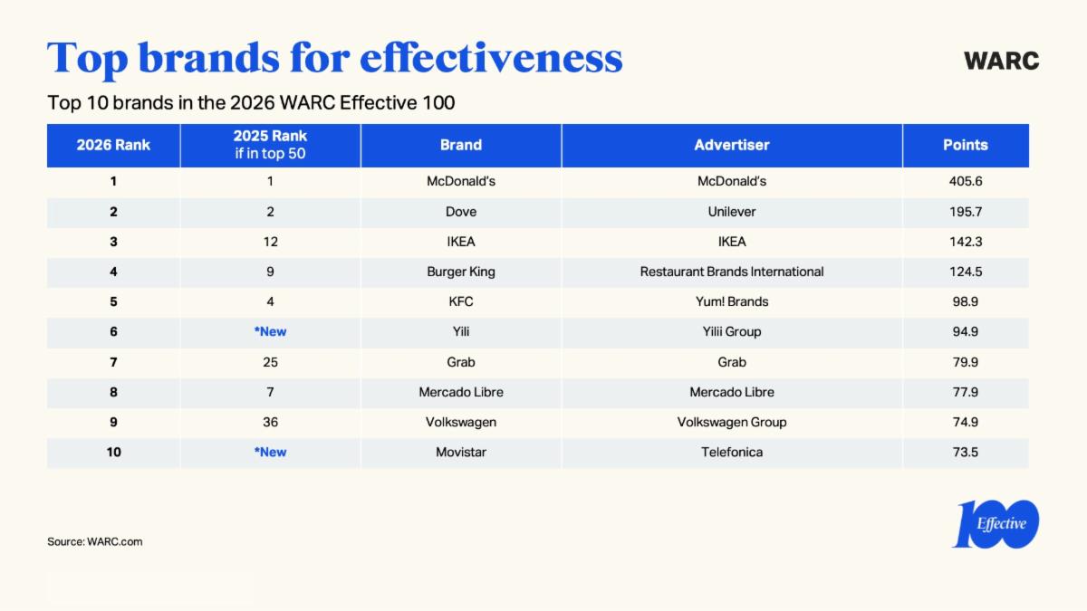 McDonald’s mantiene, per il settimo anno consecutivo, la corona di marca più efficace. La catena di fast food vanta due campagne nella top 100, ma il suo successo è dovuto principalmente all’elevato numero di premi vinti in concorsi internazionali, con ben 66 campagne presenti nel database completo delle 100 campagne più efficaci, provenienti da 29 paesi diversi in tutto il mondo. Dove si piazza al secondo posto e Ikea al terzo.