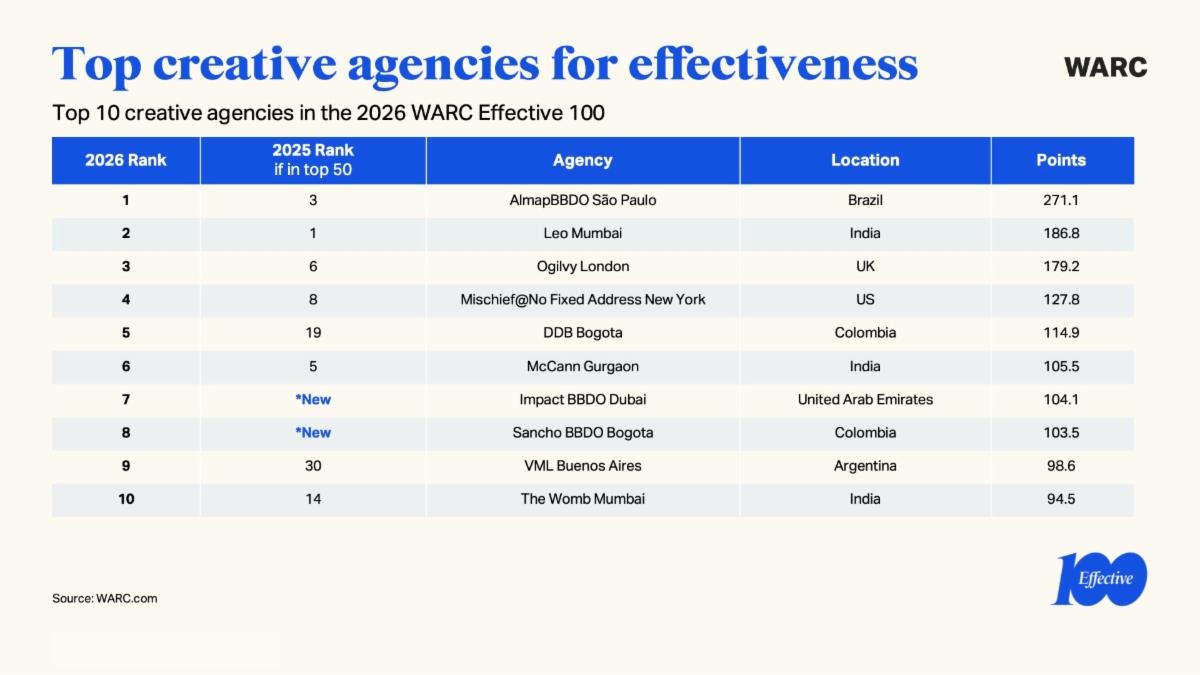 L’agenzia creativa più efficace è AlmapBBDO São Paulo con 6 campagne tra le prime 100, seguita da Leo Mumbai e Ogilvy London, mentre la prima posizione tra le sigle indipendenti è occupata da Mischief @ No Fixed Address, al quarto posto assoluto. Otto delle prime 10 posizioni sono occupate da agenzie di Mumbai, Bogotà Dubai, Guangon, San Paolo e Buenos Aires.
