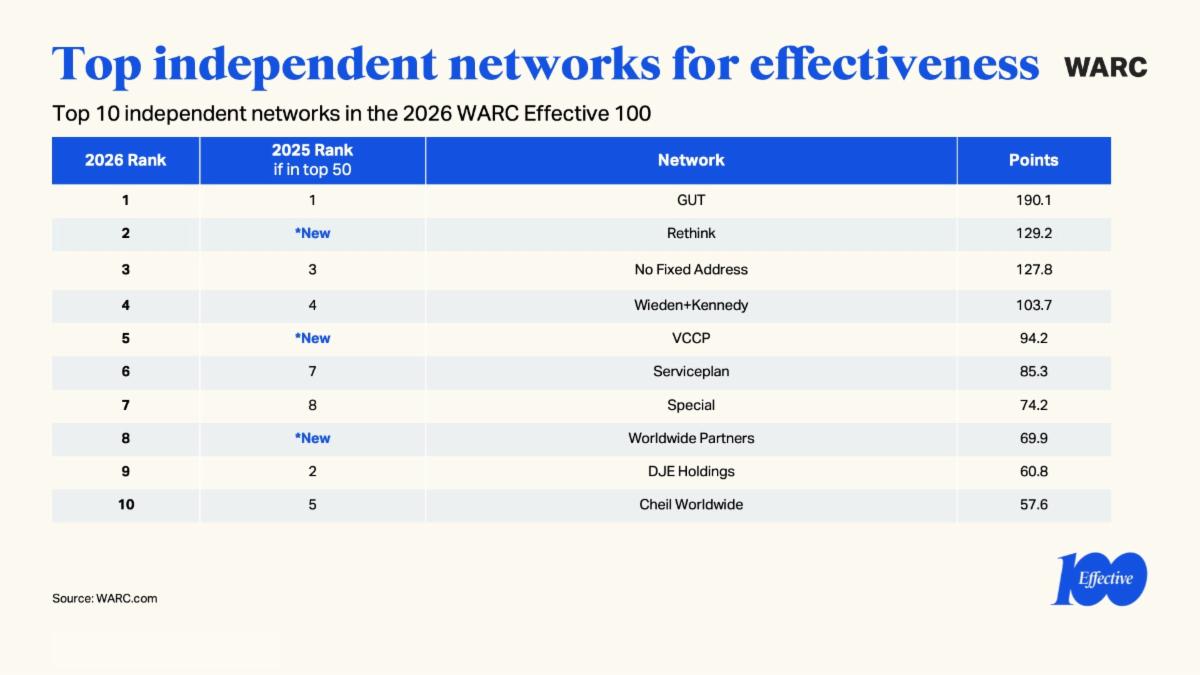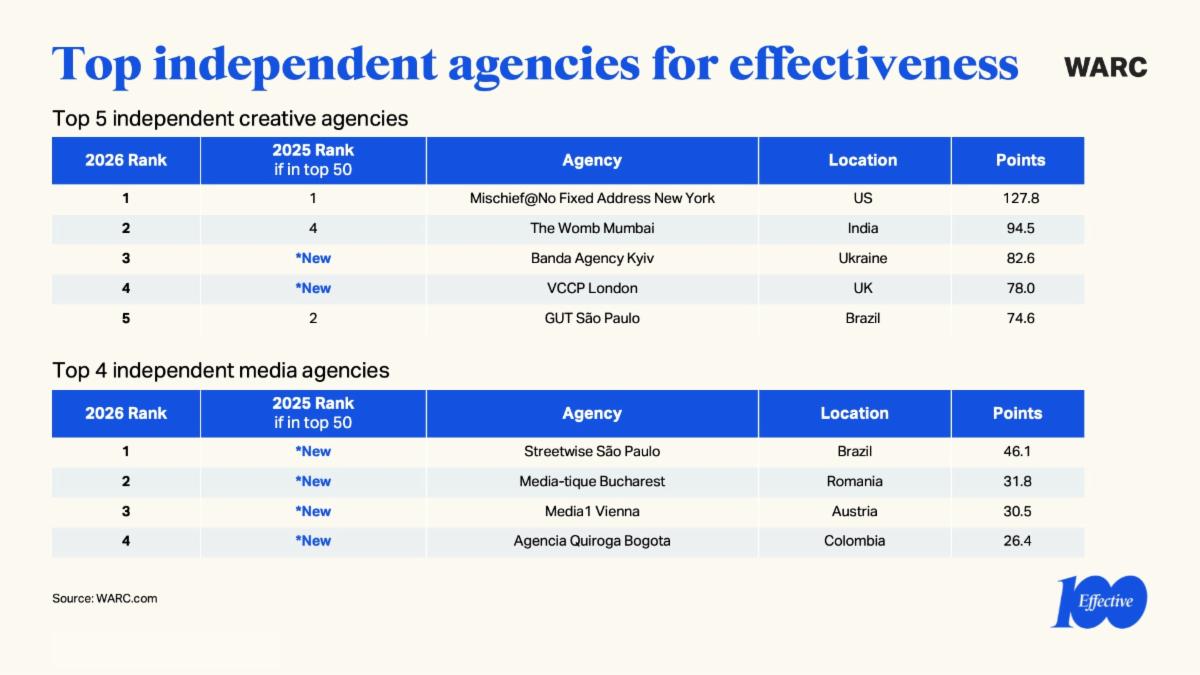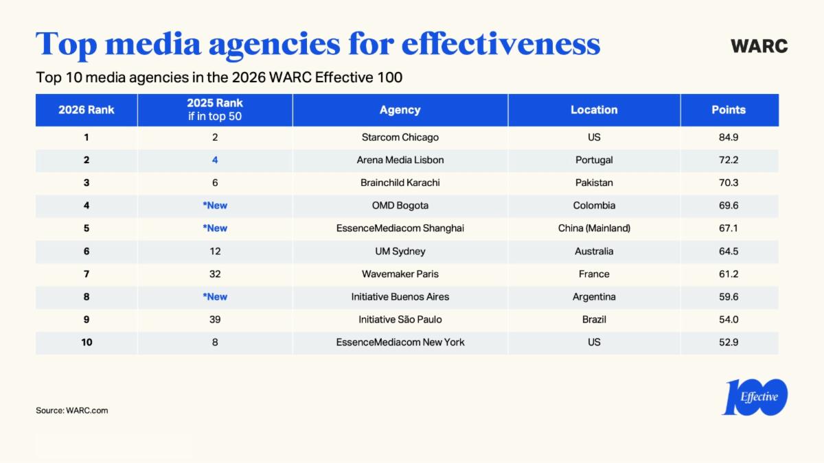 Starcom Chicago è l’agenzia media più premiata per l’efficacia, Arena Media Lisbona è al secondo posto e Brainchild Karachi occupa il terzo. Streetwise di San Paolo è la prima tra le indipendenti, seguita da Media-tique Bucarest al secondo e Media1 Vienna al terzo. Tutte e tre le sigle, informa Warc, entrano per la prima volta nella top 50.