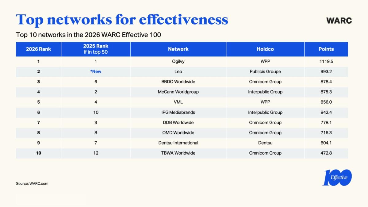 Ogilvy, per il quarto anno consecutivo, è il primo tra i network, con 13 campagne tra le prime 100, mentre Leo approda al secondo posto seguito da BBDO Worldwide. GUT è il primo tra i network indipendenti (per il secondo anno) con 5 campagne tra le prime 100, Rethink entra per la prima volta in classifica, mentre No Fixed Address mantiene la terza posizione che aveva ottenuto lo scorso anno.