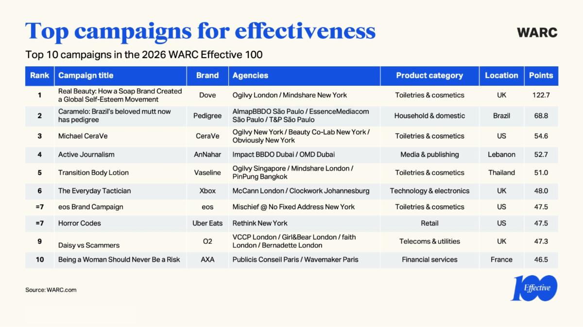 Suddivisa in 10 categorie, la classifica di Warc incorona al primo posto tra le campagne ‘Real Beauty: How a Soap Brand Created a Global Self-Esteem Movement’ di Ogilvy London e Mindshare New York per Dove (Unilever). Al secondo posto ‘Caramelo: Brazil’s beloved mutt now has pedigree’, la campagna per le adozioni di cuccioli ideata da AlmapBBDO per Pedigree. Terza, la campagna ‘Michael CeraVe’ di FCB New York.