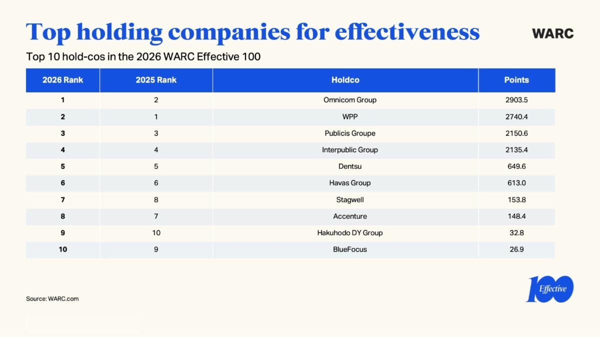 Omnicom è al primo posto tra le holding company, seguito da WPP e Publicis Groupe.